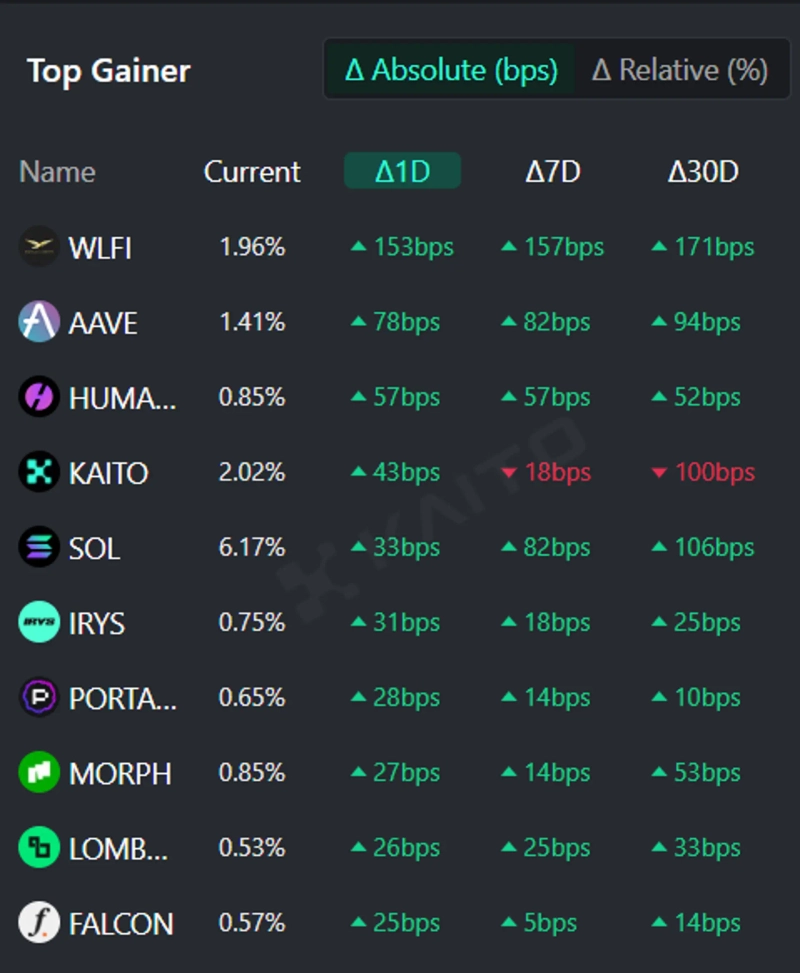 According to the Top Gainer indicator on the AI-powered web3 search platform Kaito's Token Mindshare (an indicator quantifying the influence of a specific token within the virtual asset (cryptocurrency) market), as of the 24th, the top five keywords drawing the most attention in the virtual asset space are World Liberty Financial (WLFI), Aave (AAVE), Huma Finance (HUMA), Kaito (KAITO), and Solana (SOL).