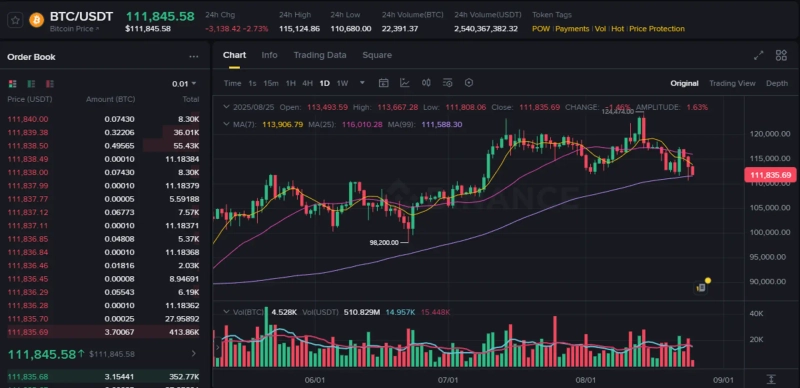 As of 3:37 PM, according to Binance USDT, Bitcoin is trading at $111,845, down 2.73% from 24 hours ago.