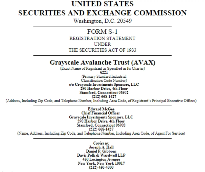 Grayscale has submitted an S-1 trust application for Avalanche (AVAX).