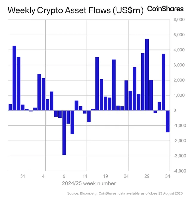 Last week, global virtual asset investment products saw a net outflow of $1.43 billion—largest since March