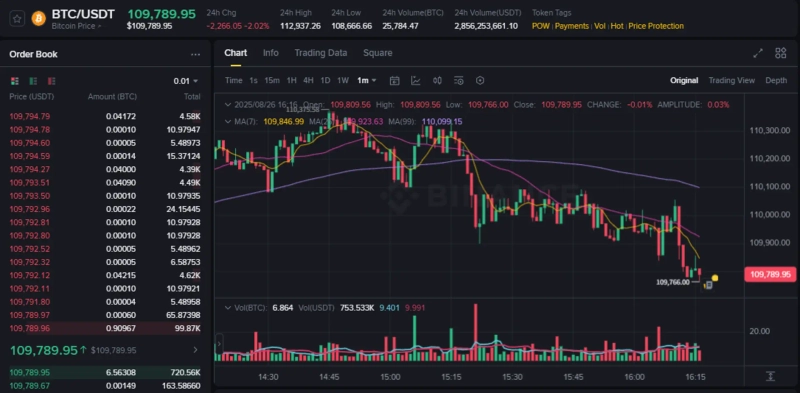 As of 4:16 PM, based on Binance USDT market, Bitcoin is trading at $109,789, down 2.02% from 24 hours ago.