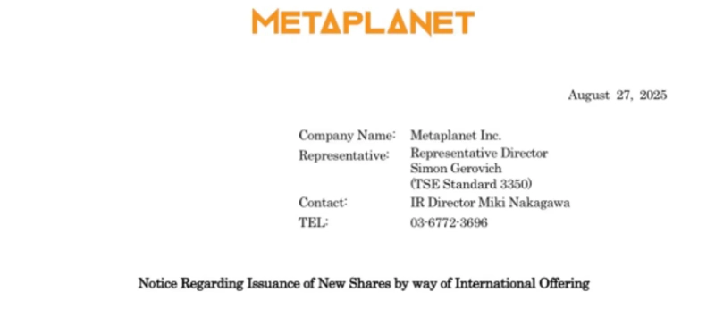 On the 27th (local time), Metaplanet announced on X (formerly Twitter), "We plan to issue new shares to raise funds for a Bitcoin purchase," and added, "A total of 555 million new shares will be issued to overseas investors outside Japan."