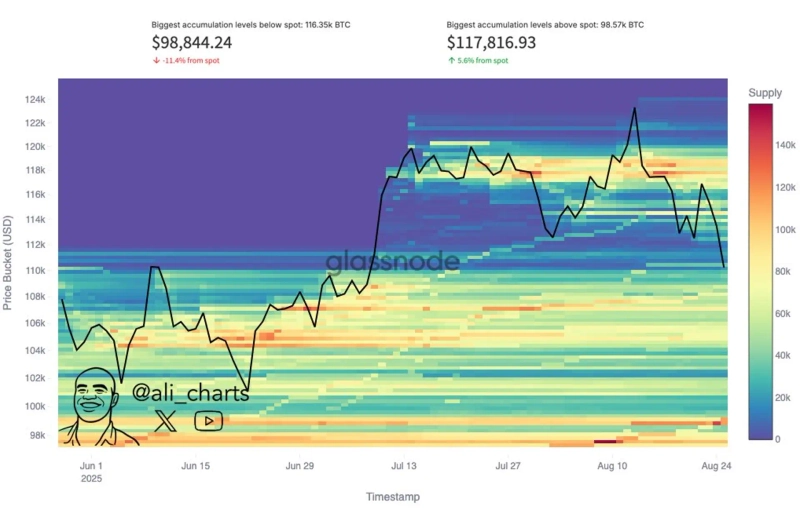 On the 31st (local time), digital asset (cryptocurrency) analyst Ali Martinez said via X (formerly Twitter), "Bitcoin's strong support range is $98,840," and "116,350 BTC were bought in that range."