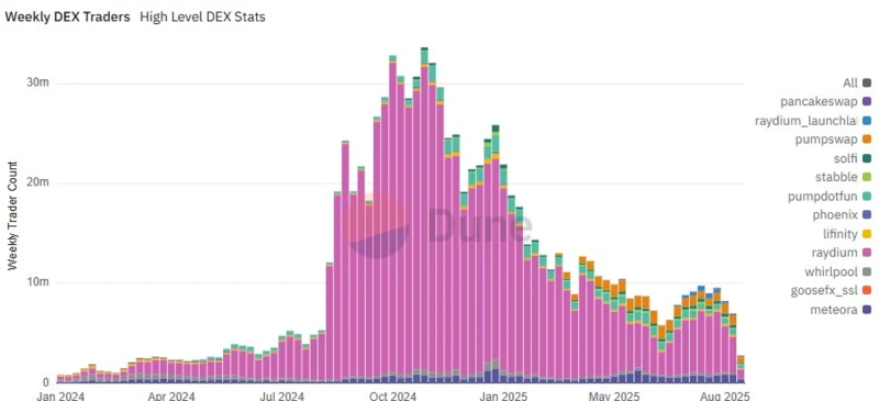 Investor activity on Solana (SOL)-based decentralized exchanges (DEXs) has fallen sharply.