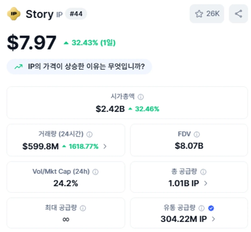 - "Story Protocol (IP)" said it showed a surge in the 32% range due to token buyback and expectations of partnerships with major domestic entertainment companies.