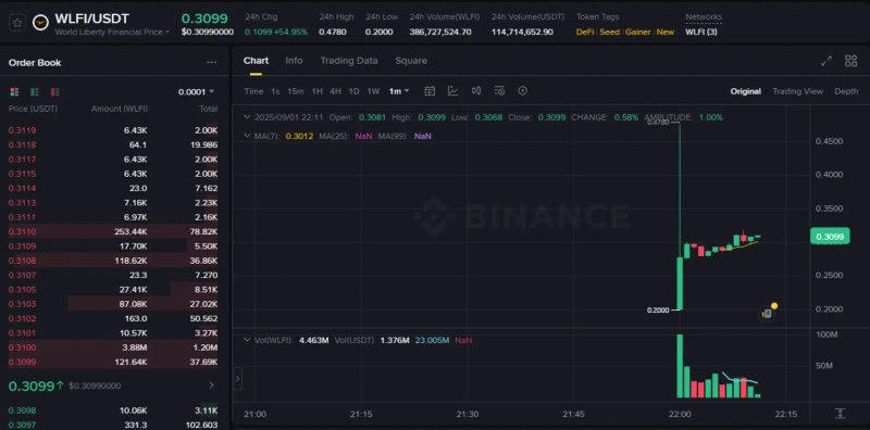 On the 1st (local time) at 22:00 (KST), trading of WLFI began on global virtual asset (cryptocurrency) exchange Binance and is showing an upward trend. On Binance's USDT market, WLFI traded at 0.3 dollars, up 50% from the listing price. On Upbit, it traded at 445 won, up 14% from the listing price.
