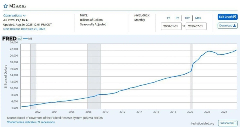 On the 1st (local time), Whale Insider said on X (formerly Twitter), "The U.S. M2 money supply recorded 22.12 trillion dollars," stating "this is an all-time high."