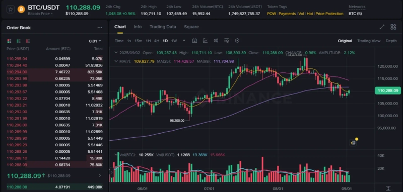 As of 10:41 PM, on the Binance USDT market, Bitcoin is trading at $110,288, up 0.96% from 24 hours earlier.