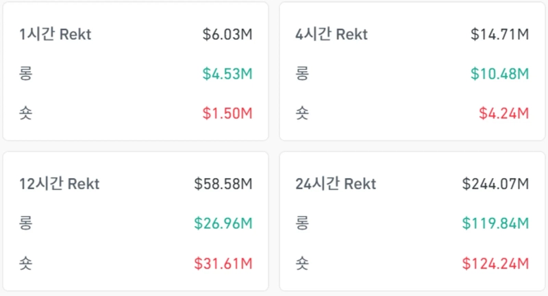 According to Coinglass data on the 3rd (local time), a total of $244.07 million in futures positions were liquidated in the virtual assets market over the past 24 hours. Specifically, $119.84 million in long positions were liquidated and $124.24 million in short positions were liquidated.