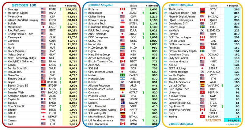 - Hodl15 Capital said the top 100 companies by Bitcoin (BTC) holdings are close to a total holdings of 1,000,000 units.