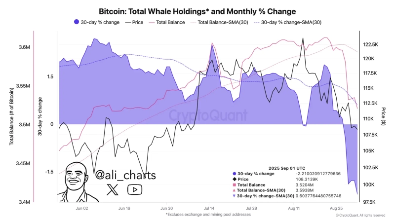 - Analyst Ali Martinez said last week whales' Bitcoin holdings decreased by 10,000.