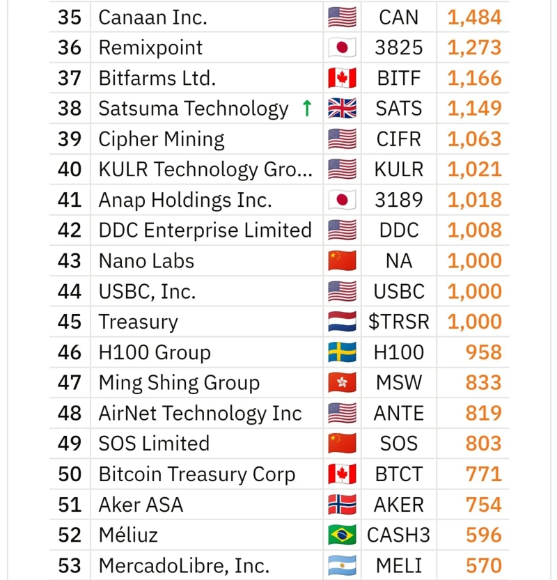 - This purchase placed Treasury at 45th in the ranking of listed companies by Bitcoin reserves.