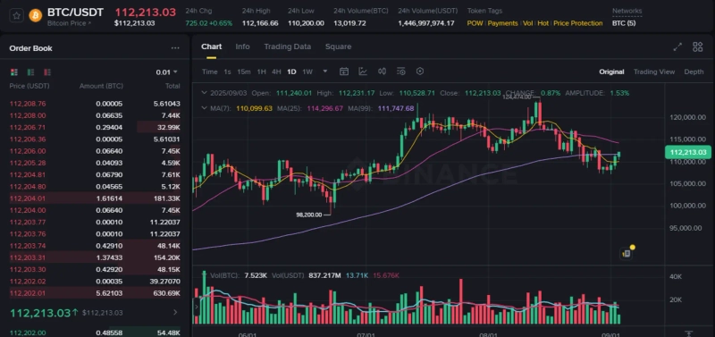 As of 11:40 PM, based on the Binance USDT market, Bitcoin is trading at 112,213 dollars, up 0.65% from 24 hours ago.