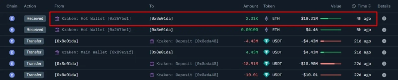 Another whale address (0x8e0) is reported to have withdrawn 2,312 ETH (approximately $10.31 million) from Kraken.