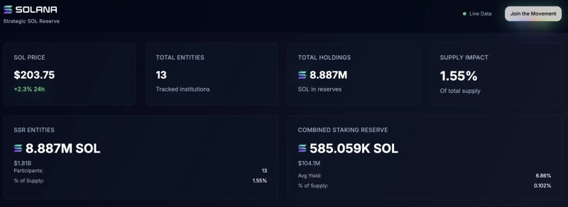 On the 4th (local time), according to the tally by Strategic SOL Reserve, 13 institutions currently hold a total of 8,887,000 Solana, which corresponds to 1.55% of the total supply. Of these, about 585,000 Solana (about 100 million 41 billion dollars) are deposited (staked). The average staking yield is 6.86%, which is about 0.102% of the total supply.