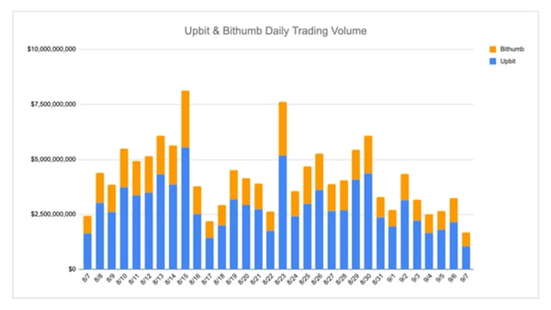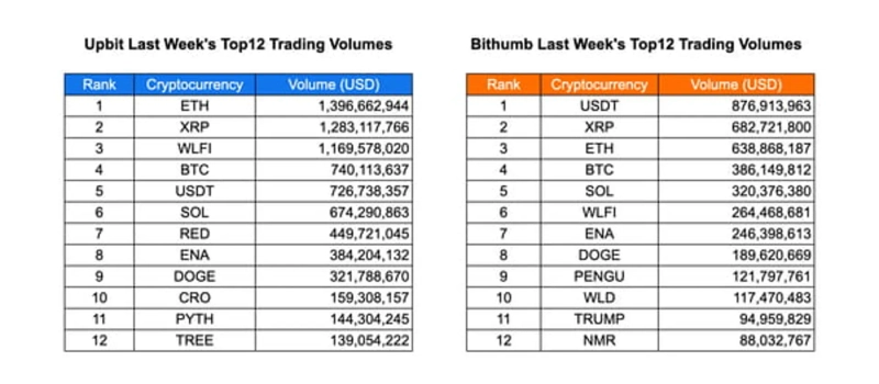 Comparing the two exchanges, ETH and XRP consistently recorded high volumes on both platforms. USDT showed a dominant advantage on Bithumb but ranked fifth on Upbit, indicating exchange-specific preferences. WLFI saw active volume and ranked third on Upbit, but had relatively lower volume on Bithumb. SOL, ENA, and DOGE maintained high volumes on both exchanges, demonstrating continued investor interest alongside established market-leading coins.