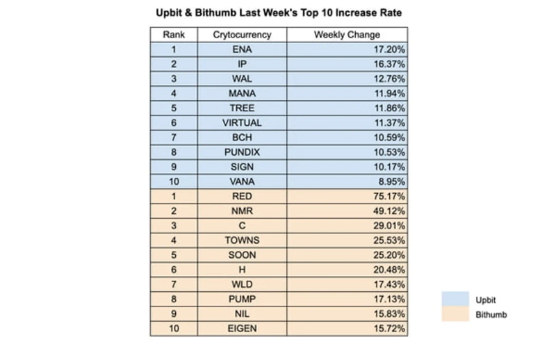 Price movements across platforms diverged sharply. On Upbit, mid-cap tokens led gains, led by ENA (+17.2%), IP (+16.4%), and WAL (+12.8%). MANA, TREE, and BCH also recorded solid single-digit gains, indicating renewed interest in established ecosystems. In contrast, Bithumb showed much higher volatility, with RED (+75%) and NMR (+49%) surging, and TOWNS, SOON, and EIGEN also showing strength. These contrasting patterns reflect different trading behaviors: Upbit favored steady growth in liquid mid-cap tokens, while Bithumb attracted speculative inflows into high-beta assets.