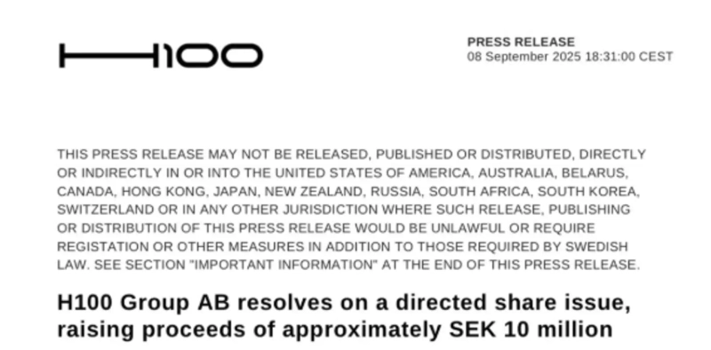 A Sweden-based healthcare company 'H100 Group' that adopted a Bitcoin (BTC) reserve strategy has raised 1,070,000 dollars.