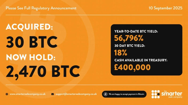 UK-listed Smarter Web Company (SWC) has reportedly purchased an additional 30 Bitcoins (BTC).