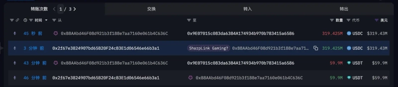 On the 11th (local time), Amber CN reported on X, "In the past 45 minutes, SharpLink received Tether (USDT) and USDC totaling $379,000,000 and then transferred them to Galaxy Digital's OTC wallet. SharpLink appears likely to soon buy additional Ethereum."