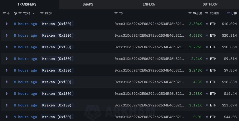On the 11th (local time), LookonChain said on X, "Institutional investors' Ethereum purchases continue. A total of 78,229 ETH (about $342 million) was withdrawn from Kraken into four newly created wallets in the past 10 hours."