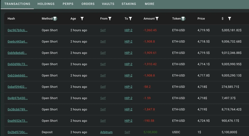 The position size totals 10,796 ETH (about 51 million dollars), and the liquidation price was 5,086.9 dollars. Meanwhile, Ethereum is currently trading on CoinMarketCap at 4,720.82 dollars, up 4.66% from the previous day.