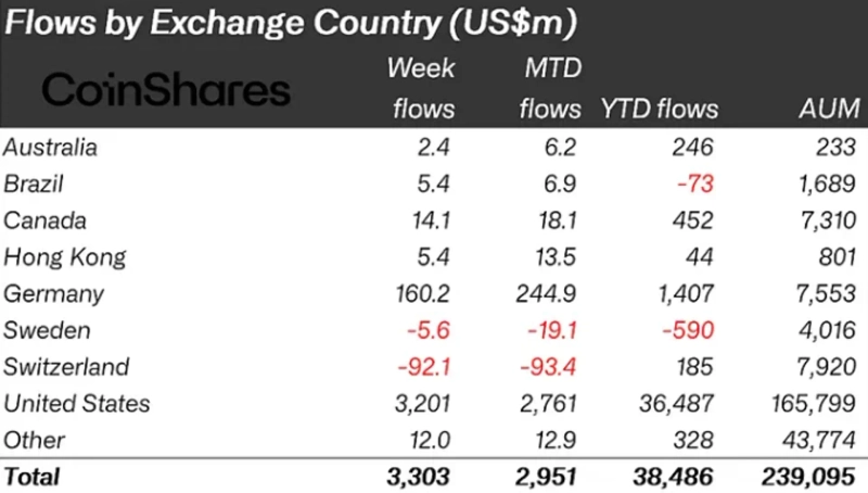 By country, inflows from the U.S. were strong. About $3.2 billion flowed into U.S.-based digital asset products alone, while Germany and Canada saw inflows of $160.2 million and $14.1 million, respectively. Conversely, Switzerland and Sweden saw outflows of $92.1 million and $5.6 million, respectively.