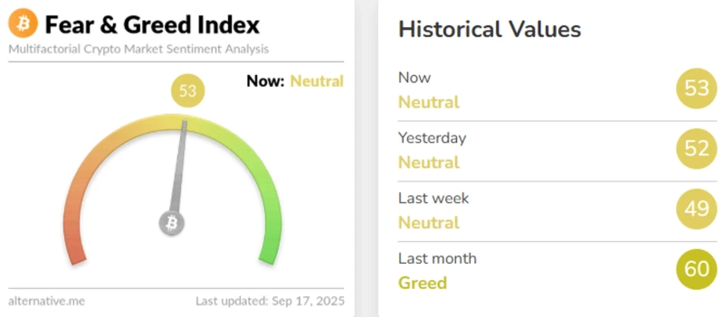 On the 17th (local time), the Fear & Greed Index provided by virtual asset analysis firm Alternative was 53 out of 100, remaining in the 'neutral' stage. The index rose by 1 point from the previous day (52 points), showing a slight recovery in market sentiment.