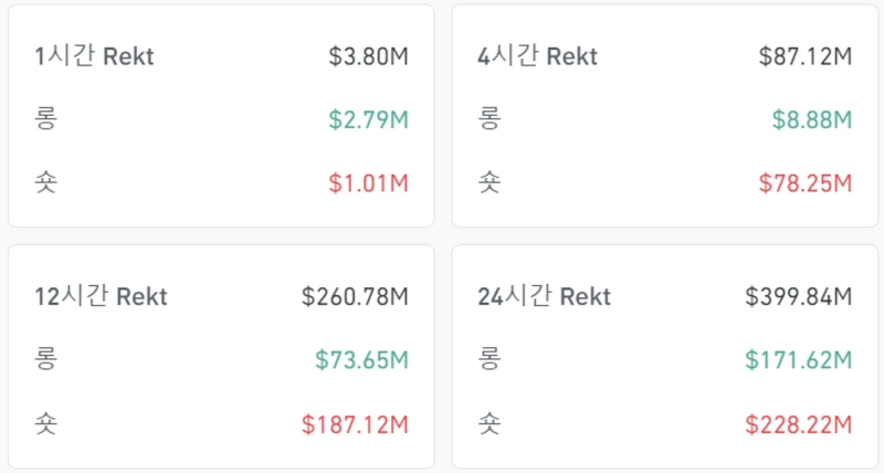 According to CoinGlass data on the 18th (local time), $399.84 million worth of futures positions were liquidated in the virtual asset market over the past 24 hours. Specifically, long positions totaling $171.62 million were liquidated, and short positions totaling $228.22 million were liquidated.