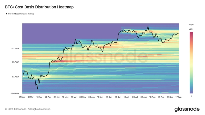 - Glassnode said that on the Bitcoin cost-basis distribution heatmap, supply is concentrated in the $117,000 range, forming a major resistance zone.