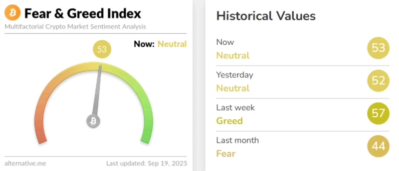 On the 19th (local time), the Fear and Greed Index provided by virtual asset analytics firm Alternative is currently 53 out of a 100-point scale, maintaining the 'Neutral' stage. The index rose by 1 point from the previous day (52 points), showing a slight contraction in market atmosphere.