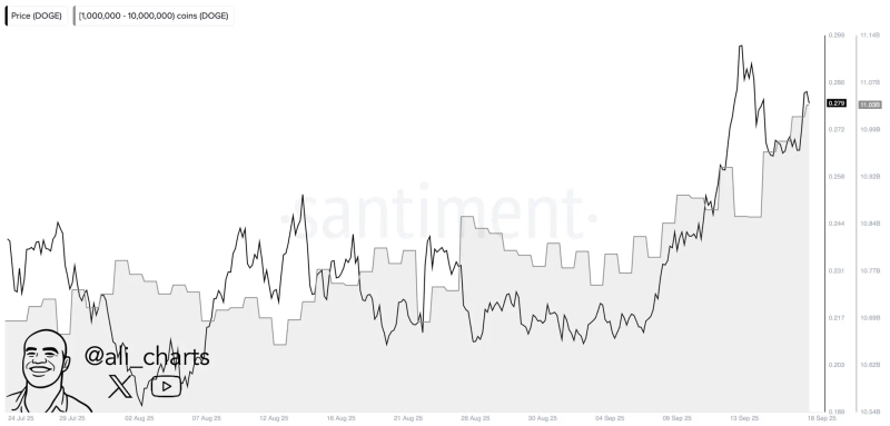 On the 19th (local time), crypto asset analyst Ali Martinez said on X (formerly Twitter), "Whale investors have accumulated more than $158 million worth of Dogecoin."