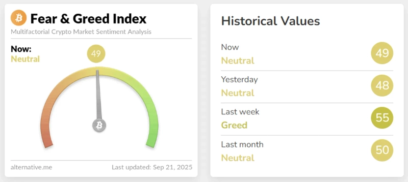 On the 21st (local time), the Fear and Greed Index provided by virtual asset analytics company Alternative stood at 49 out of 100, maintaining the 'neutral' stage. The index rose 1 point from the previous day (48 points), showing a slight recovery in market sentiment.