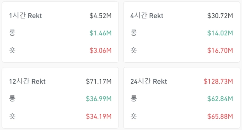On the 21st (local time), according to CoinGlass data, a total of 128.73 million dollars worth of futures positions were liquidated in the virtual assets market during the past 24 hours. Specifically, long positions worth 62.84 million dollars were liquidated, and short positions worth 65.88 million dollars were liquidated.