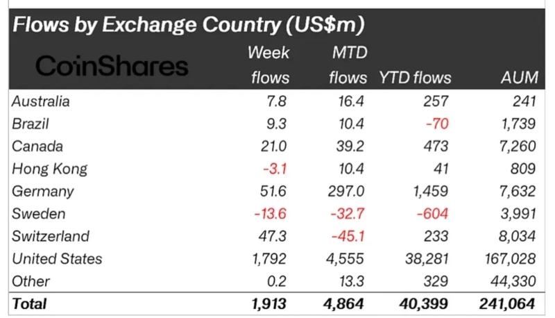 By country, inflows from the United States were strong. U.S.-based crypto products alone had net inflows of about $1.792 billion, and Germany and Switzerland saw $51.6 million and $47.3 million respectively. Meanwhile, Sweden and Hong Kong experienced outflows of $13.6 million and $3.1 million respectively.