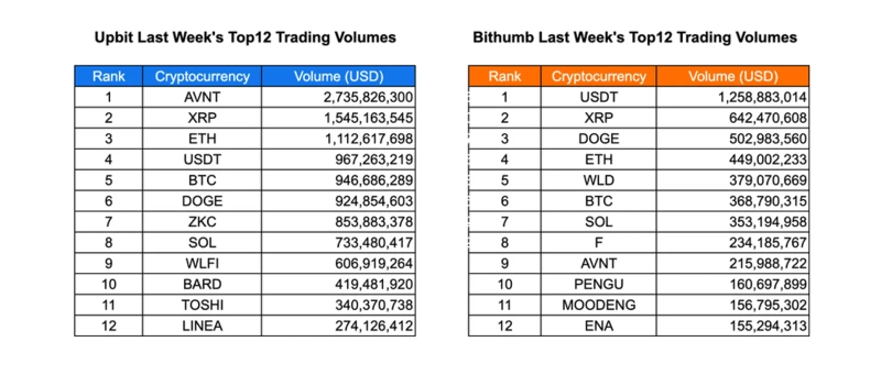 Overall, trading activity showed distinct exchange preferences. Upbit relied heavily on AVNT and other mid-cap tokens, while Bithumb showed strength in USDT and newly listed items. That both high-quality cryptocurrencies and speculative tokens appear in the rankings indicates diversified market participation from both retail and institutional investors.