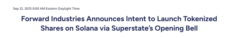 On the 23rd (local time), according to Business Wire, Forward said in a press release that 'it plans to collaborate with Superstate to tokenize its shares on the Solana blockchain.' As a result, shareholders will be able to tokenize Forward Industries' shares through Superstate's Opening Bell platform.