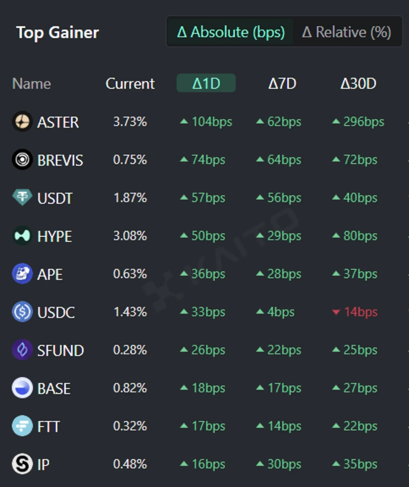 - According to Kaito's Token Mindshare, Aster, Brevis, Tether, Hyperliquid, and ApeCoin are currently receiving high interest in the crypto market.