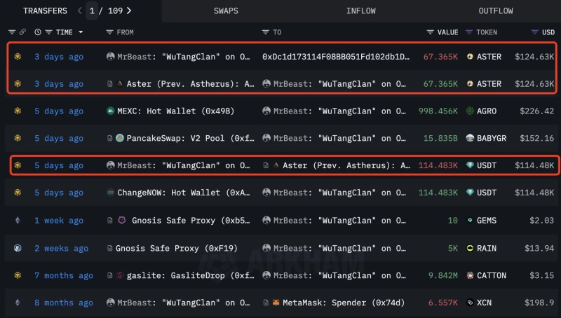 According to on-chain data, MrBeast deposited a total of $1,000,000 worth of Tether (USDT) to the ASTER platform via a public wallet (0x9e67) and a new wallet (0x0e8A), then withdrew 538,384 ASTER. The average purchase price is estimated to be about $1.87.