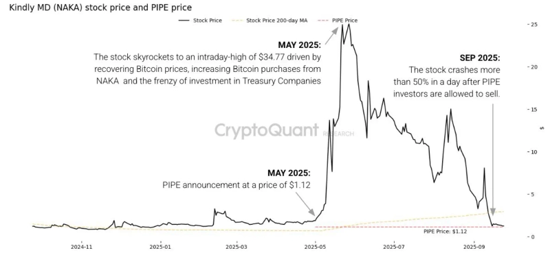 He cited the share price movement of Bitcoin treasury company Kindly MD (Kindly MD·NAKA) as an example. According to CryptoQuant research, NAKA soared intraday to $34.77 in May amid increased Bitcoin buying and a corporate investment boom. However, when the PIPE investor lockup was lifted last September, it plunged more than 50% in a single day, starkly revealing investors' short-term selling pressure.