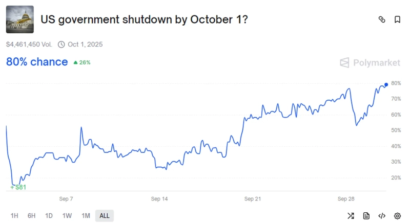 Decentralized prediction platform Polymarket says the probability that the U.S. government will enter a temporary work stoppage (shutdown) on the 1st has reached 80%.