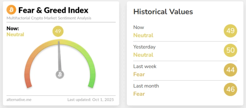 On the 1st (local time), the Fear & Greed Index provided by crypto asset analytics firm Alternative is currently 49 out of 100, maintaining the 'neutral' phase. The index fell 1 point from the previous day (50 points), showing a slightly contracted market atmosphere.