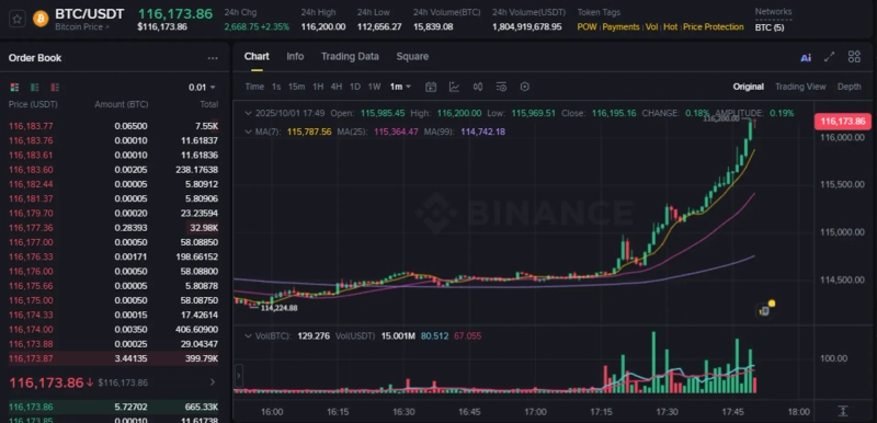 On the 1st (local time), on the Binance USDT market, Bitcoin is trading at $116,173, up 2.35% from 24 hours earlier.