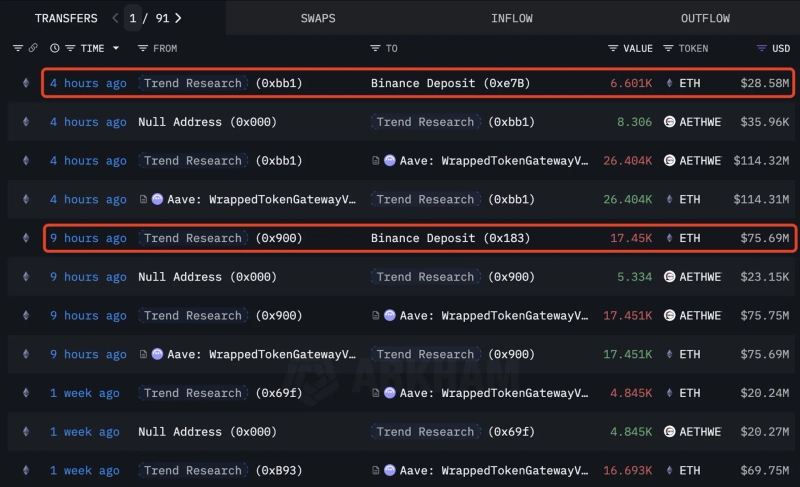 On the 2nd (local time), LookonChain reported that a Trend Research-estimated address and two whale addresses recently showed movements selling large amounts of Ethereum.