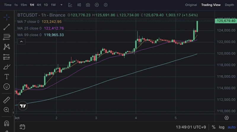 According to Binance on the 5th, as of 1:50 p.m., bitcoin was trading at 125,568 dollars (178,380,000 won on Upbit), up 2.47% from the previous day. Intraday, bitcoin reached a record high of 125,708 dollars.