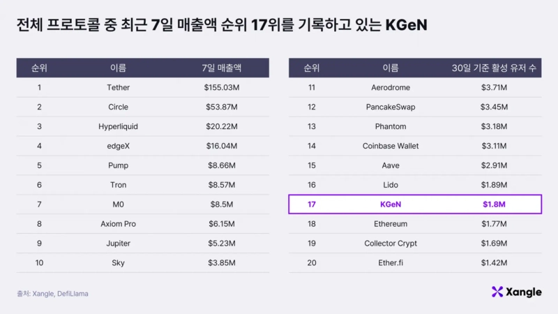 Revenue indicators are also growing sharply. As of October 2, according to DeFiLlama, KGeN’s revenue over the past 7 days was $1.8M, ranking 17th among all protocols. Annualized, this amounts to about $62 million. This indicates that revenue generated from actual service usage and transaction activity is accumulating stably, not solely dependent on token incentives.