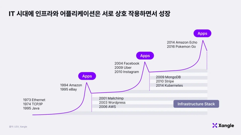 For Web3 to become mainstream, users are ultimately necessary. Looking back at the IT industry development cycle, infrastructure was always built first, and applications emerged on top of it, leading to full-scale growth. This can be seen in cases where infrastructure such as Ethernet, TCP/IP, and Java was established first, and then applications like Amazon, Facebook, and Uber were launched, driving mass adoption.