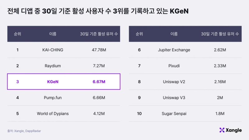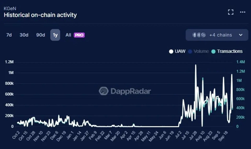 KGeN has driven rapid mainstream adoption by producing meaningful growth indicators within two and a half years of launch. According to data from Dune Analyst(@kgen), as of October 2, the cumulative number of wallets that have interacted with KGeN at least once exceeded 29 million. Also, according to DappRadar, the number of active wallets in the past 30 days is about 6.8 million, ranking third among all blockchain dApps.