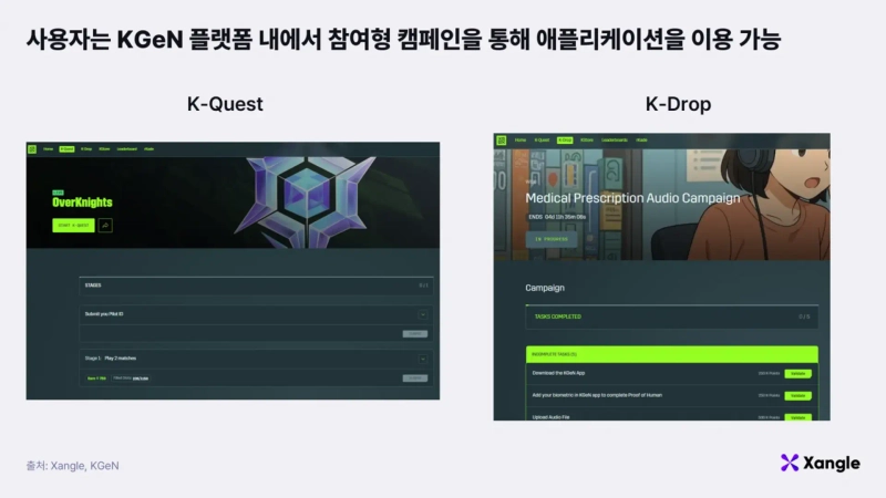 KGeN provides a platform where users can be active across various applications. Currently supporting services focused on games and AI, users can experience multiple projects and leave activity data through participatory campaigns called K-Quest and K-Drop within the platform. Both K-Quest and K-Drop are participatory quest campaigns, but they differ in verification methods. K-Quest is based on manual verification, while K-Drop automatically verifies activities through API endpoints and real-time integration.