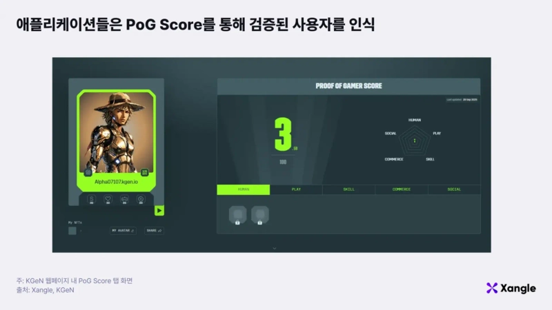 The collected activity data is analyzed by KGeN’s core mechanism, the PoG (Proof of Gamer) engine. The PoG engine goes beyond simple participation logs to analyze and quantify users’ behaviors and characteristics multidimensionally. The engine classifies data across five axes: first, Proof of Human to verify actual human users; second, Proof of Play to measure game play and engagement; third, Proof of Skill to evaluate proficiency based on tournament performance and in-game achievements; fourth, Proof of Commerce to reflect economic contribution; and finally, Proof of Social Network to measure social networks and influence. These five axes operate independently while complementing each other to produce a reputation metric called the PoG Score for each user.